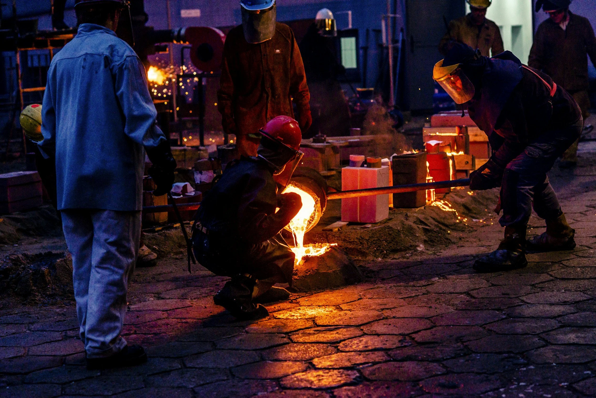 Next, molten metal is poured into the cavity, filling the space left by the melted resin-wax. The metal is allowed to cool and solidify, taking on the intricate details of the mold. Once cooled, the mold is broken away, revealing the newly cast metal piece.